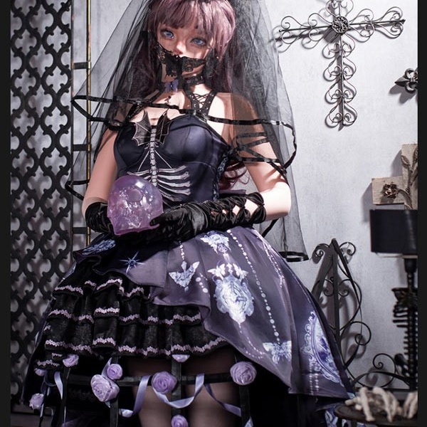 ワンピース ロリータ ハロウィン スケルトン風 魔女風 ティアードスカート フィッシュテール レディース ノースリーブ ゴスロリ ゴシック 暗黒風 ロリィタファッション コスチューム コスプレ 衣装 可愛い 仮装 パーティー イベント パープル ブラック 黒 S M L XL mj002m4