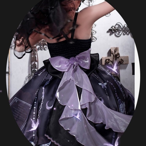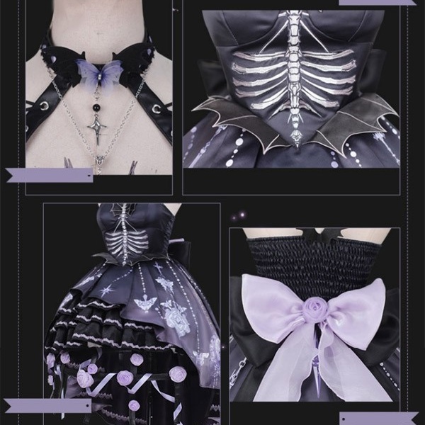 ワンピース ロリータ ハロウィン スケルトン風 魔女風 ティアードスカート フィッシュテール レディース ノースリーブ ゴスロリ ゴシック 暗黒風 ロリィタファッション コスチューム コスプレ 衣装 可愛い 仮装 パーティー イベント パープル ブラック 黒 S M L XL
