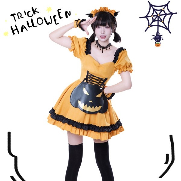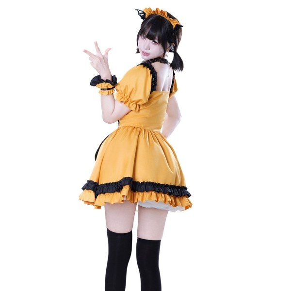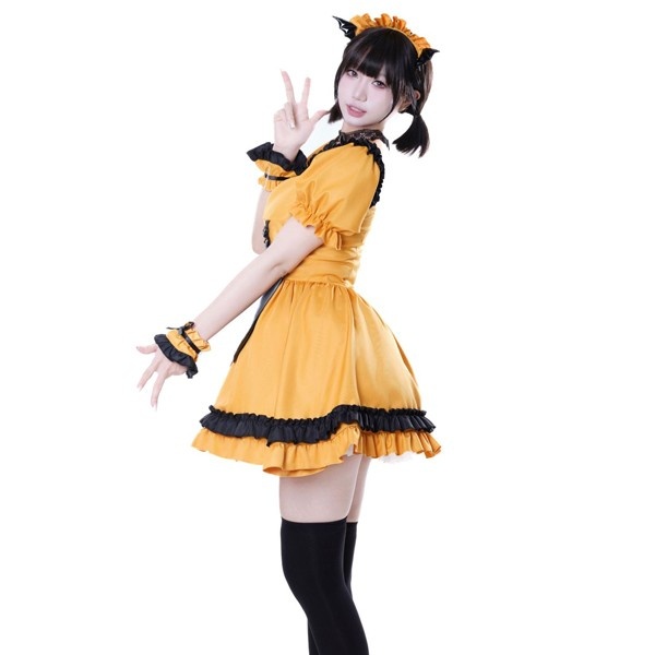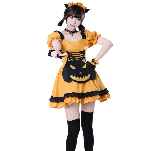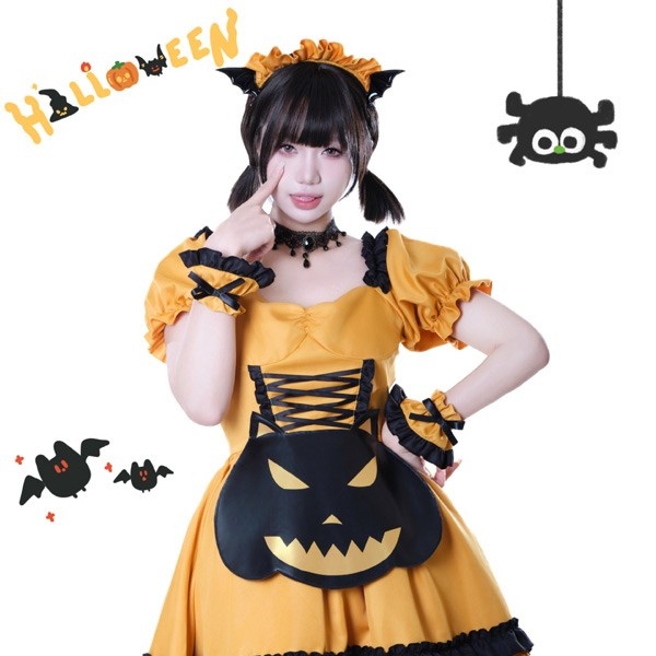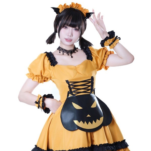 ロリータ ハロウィン メイド服 コスチューム かぼちゃ 魔女風 ウィッチ 吸血鬼 ショート丈 半袖 パフスリーブ フリル レディース ゴスロリ ロリィタファッション コスプレ 衣装 洋服 可愛い 仮装 パーティー イベント ステージ 文化祭 学園祭 イエロー ブラック 黒 S M L