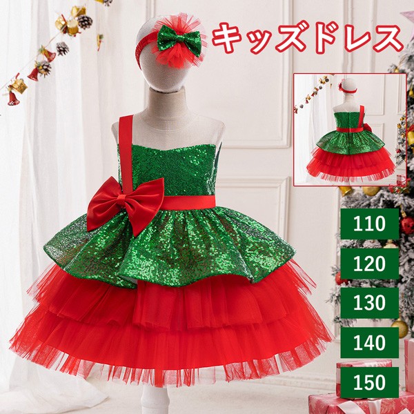 キッズドレス クリスマス アシンメトリードレス キラキラ パーティー リボン ドレス 膝丈 ノースリーブ 袖なし コスチューム衣装 子供ドレス パーティードレス カラードレス お姫様 女の子 子供 かわいい ステージ 演出 イベント 写真用 グリーン 110 120 130 140 150