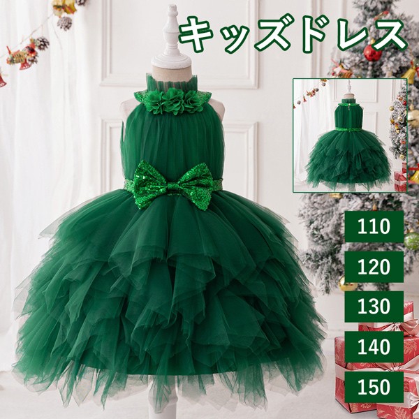 キッズドレス クリスマスツリー風 パーティー リボン ドレス 膝丈 ノースリーブ 袖なし コスチューム衣装 子供ドレス パーティードレス カラードレス ワンピース お姫様 女の子 子供 かわいい ステージ 演出 イベント 写真用 グリーン 110 120 130 140 150