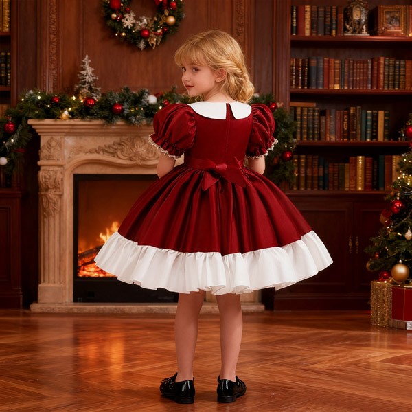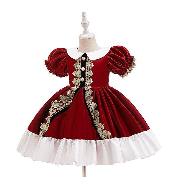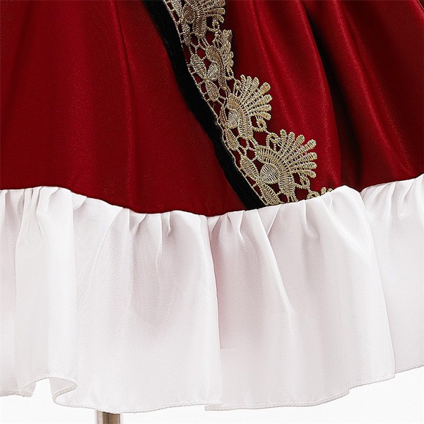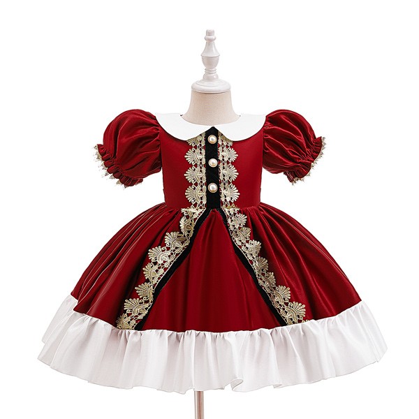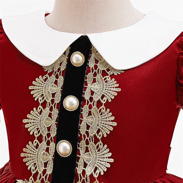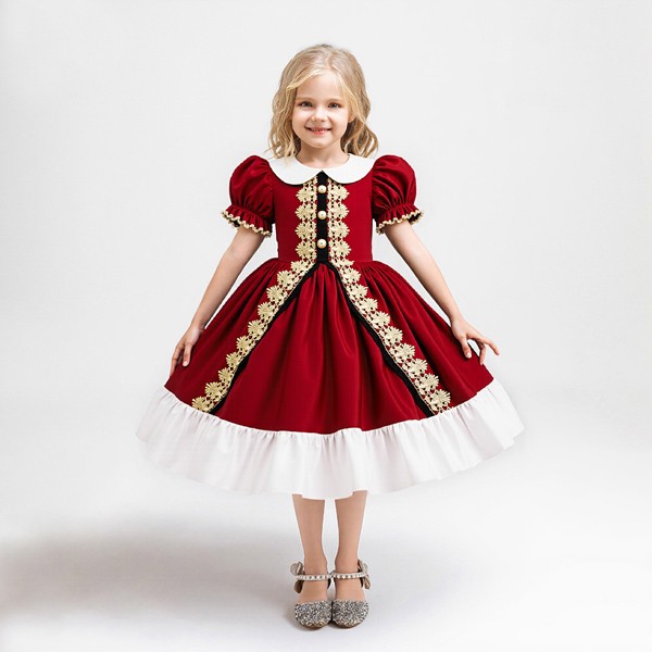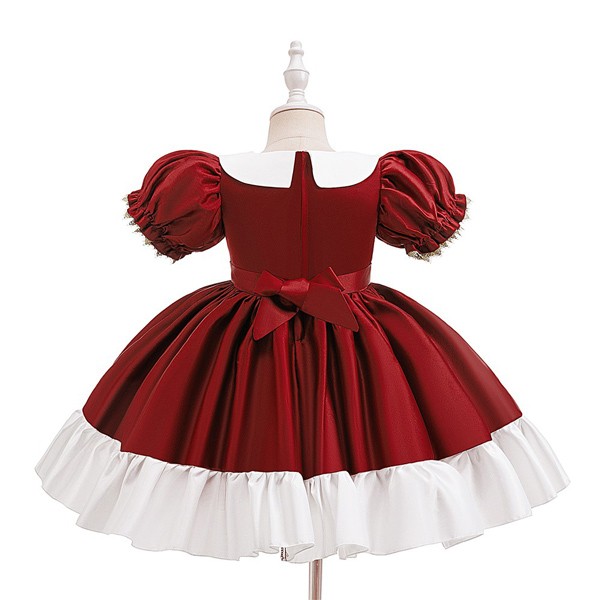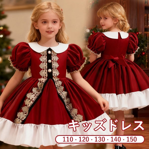 キッズドレス パーティー クリスマス風 レース ドレス 膝丈 半袖 パフスリーブ コスチューム衣装 子供ドレス パーティードレス カラードレス ワンピース お姫様 プリンセス風 女の子 子供 かわいい 誕生日 ステージ 演出 イベント 写真用 レッド 110 120 130 140 150